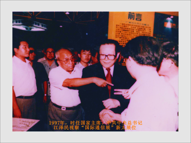 1997年,国家主席、中共中央总书记江泽民视察“国际通信展”佳都科技展位。