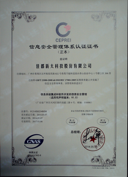 2014年3~4月,佳都科技顺利通过了国际标准及权威的ISO27001信息安全认证体系和ISO20000信息技术服务管理体系,取得了广州赛宝认证中心颁发的ISO/IEC 27001:2005信息安全管理体系认证证书和ISO/IEC 20000-1:2011信息技术服务管理体系认证证书。