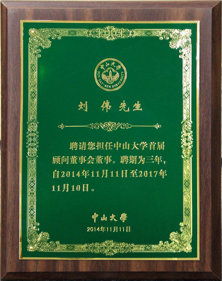 据了解,中山大学顾问董事会是由具有较高学术地位和社会声望的各界专家、校友、社会贤达组成的高层决策咨询、参谋机构,是学校与社会各界全面、紧密合作的桥梁和纽带。2014年,刘伟先生正式聘请担任首届顾问董事会董事,聘期三年。