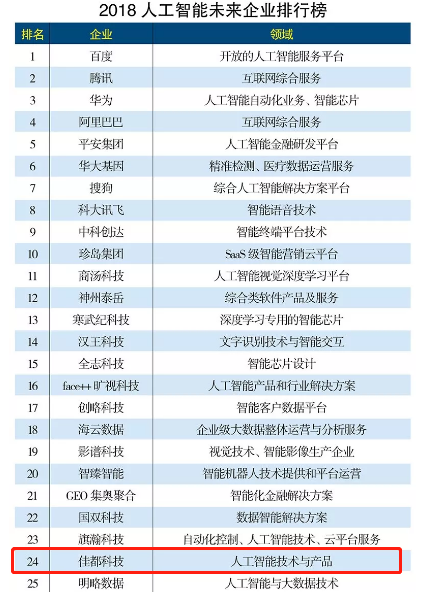 再传佳音丨佳都科技登2018人工智能未来企业排行榜