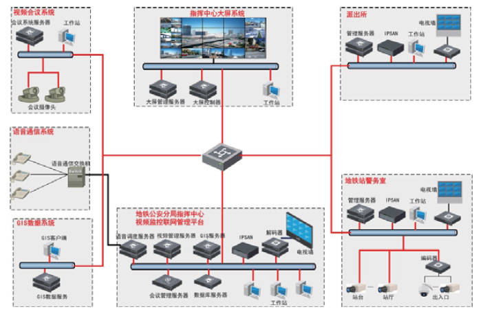 地铁视频解决方案以系统平台的建设为核心,整合各个派出所、站点接警室、无线有线视频监控资源、语音资源、地理信息资源及内部会议系统、大屏系统等庞大的视频监控资源的复杂系统。整个系统的控制和调度以地铁公安分局监控指挥中心为枢纽,以各个派出所监控中心为子中心的两级视频交互及交换平台。平台在监控指挥中心的统一指挥调度下,充分共享系统内的视频、信息资源。架构图如下所示: